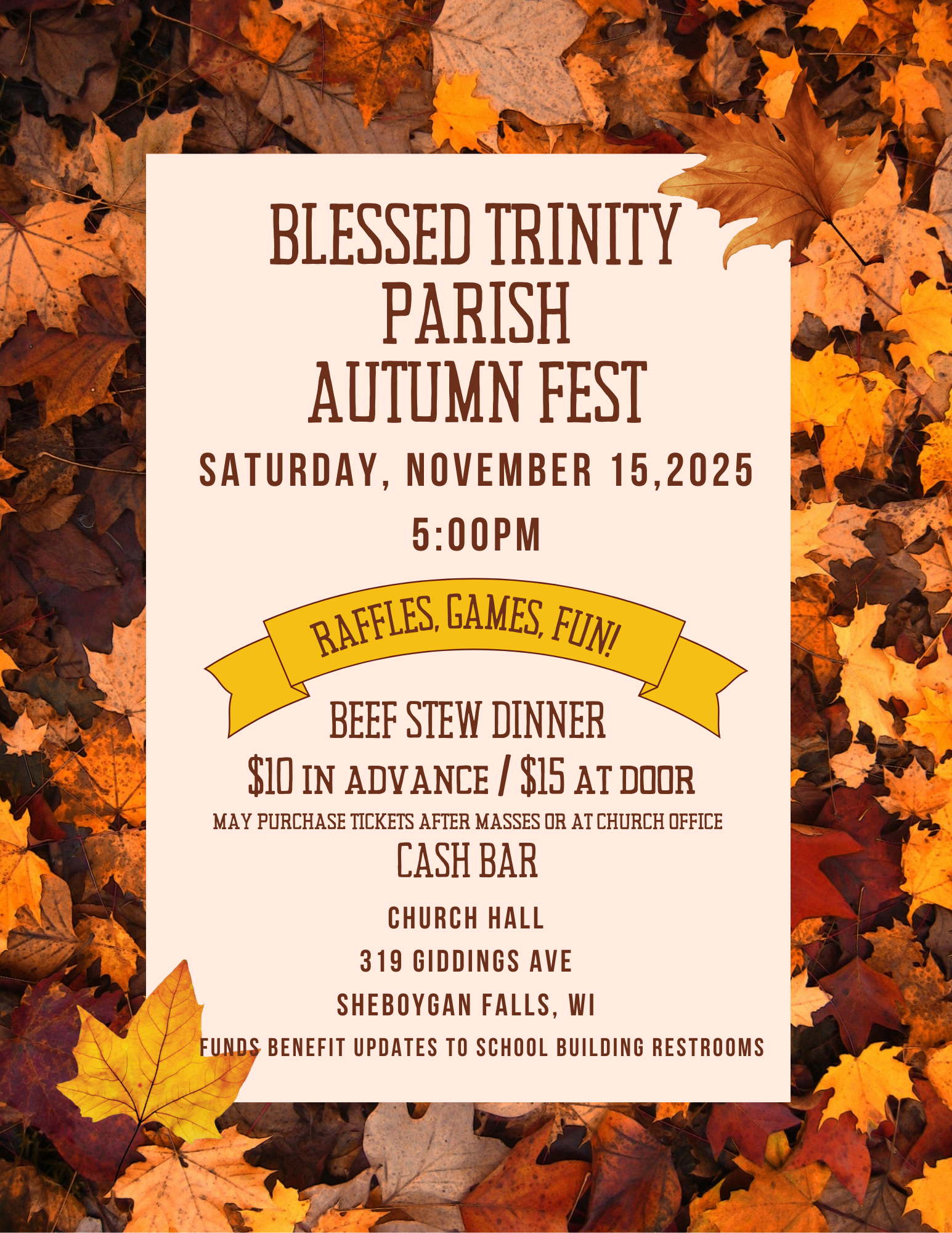 For more information on the Autumn Fest Parish Fundraiser or directions to the parish, please visit our website: www.blessedtrinitysheboyganfalls.org.