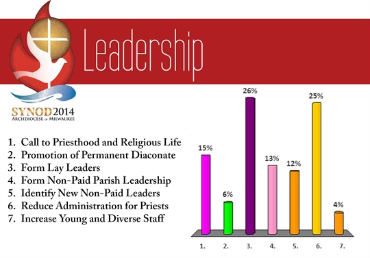 Hundreds of Catholics representing more than 200 parishes, schools and Catholic organizations throughout the Archdiocese of Milwaukee gathered the weekend of June 6-8 for “Synod 2014” to deliberate on and determine the priorities of the Catholic Church in southeastern Wisconsin for the next decade and beyond. Below are graphs of the voting results. For a full description of the Key Initiatives and voting percentages, click here.
