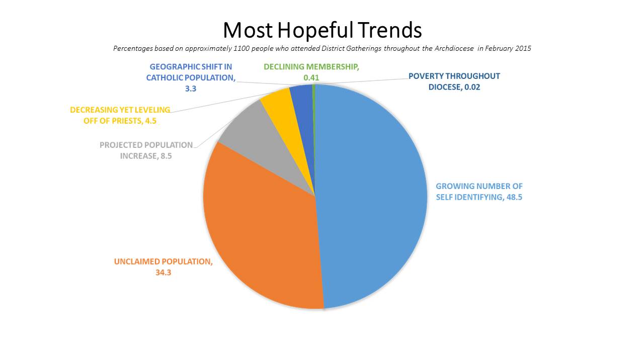 These trends came from the CARA Report that was produced for the archdiocese. An informal stand-up survey was conducted regarding what people saw as the most concerning of these trends and what were the most hopeful trends. The result below are percentages based on approximately 1,100 people who attend the district gatherings.